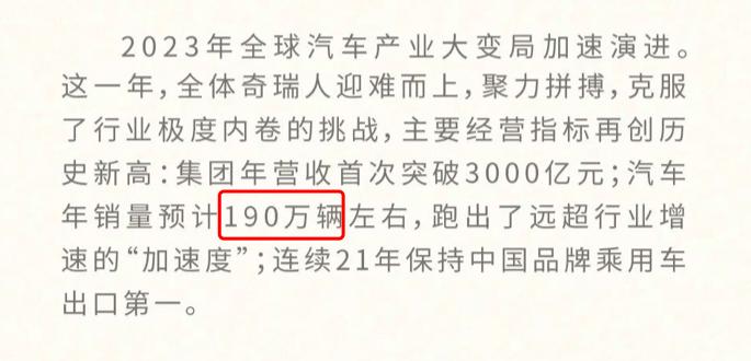 另一家传统车企,奇瑞也在2023年取得了不错的成绩。在其发布的2024年新年献词里,尹同跃提到,奇瑞2023年累计销量约190万辆,集团营收首次突破3000亿元,连续21年保持中国品牌乘用车出口第一。