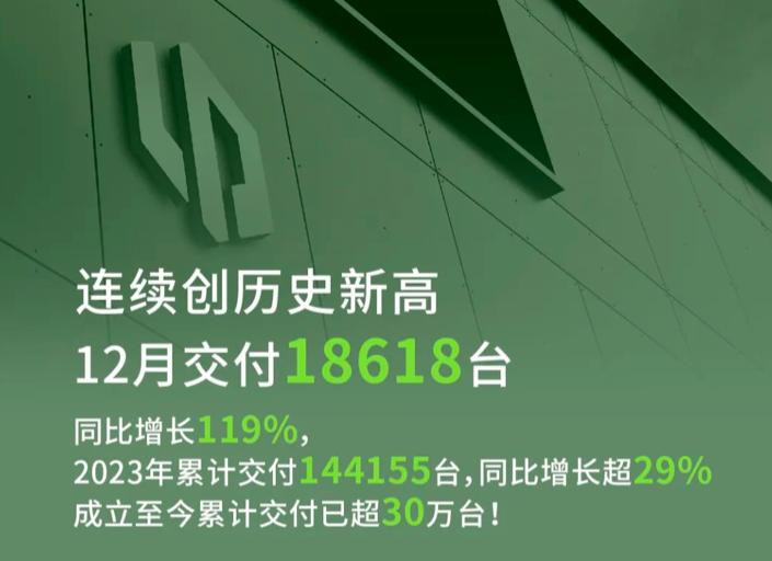 2023年12月,零跑汽车交付量为18618台,同比增长119%,2023年全年累计交付144155台,同比增长超29%,成立以来累计交付超30万台。