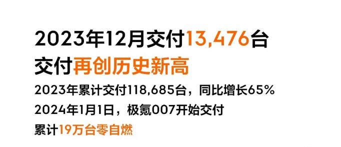 极氪品牌在12月份交付量约1.35万辆,同比增长18.9%。2023年全年累计交付量为118685辆,同比增长超过65%,截至12月底,极氪已完成了超过19万辆的全球交付,尽管数据亮眼,但可惜依旧没能完成此前定下年销14万辆的目标。