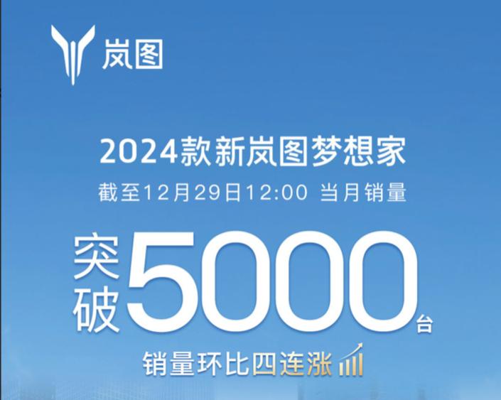 万万没想到,在2023年即将结束的时候,来自东风旗下的岚图汽车给了人们一个惊喜,率先发布了2023年12月的部分销量:截至12月29日12:00,2024款新岚图梦想家当月销量突破5000台。