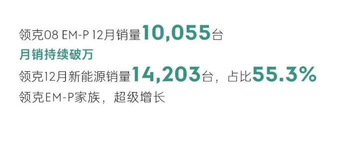 领克品牌在2023年全年累计销量为220250辆,其中爆款车型领克08 EM-P上市后月度销量持续破万,在12月份达到10055辆。