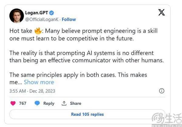 然而,ChatGPT、GPT-4背后OpenAI公司有的员工似乎并不这么认为。近日OpenAI开发者推广大使Logan Kilpatrick在社交平台发文称,“热门观点:现在有很多人认为,为了在未来保持竞争力必须掌握提示词工程技能。但事实上,提示人工智能系统和与他人进行有效沟通并没有本质的区别。”