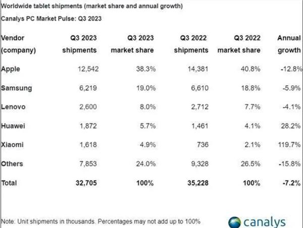 调研机构Canalys公布的2023年第三季度全球平板电脑市场报告中,苹果、三星、联想、华为、小米分列市场份额1-5名。其中苹果凭借38.3%的份额继续领跑,华为、小米是前五名中唯二的份额逆势上涨的厂商。