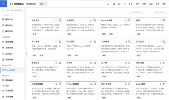 以百度千帆为例,其内置了百余款Prompt模板,包含对话、编程、电商、医疗、游戏、翻译、演讲等十余个场景,相关企业可以直接选择某一个模型或者在已有模型的基础上再根据自身的要求加入数据进行微调。