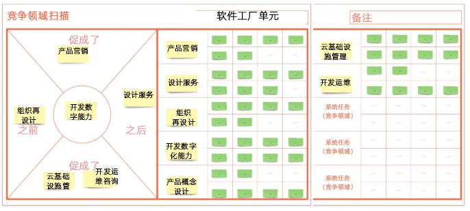 比如在上图所举的这一特殊的例子中,左上角的业务部门由于感知度高,可以更有效地重组为两个面向用户的“微型企业”:一个提供以产品为中心的组织咨询,以促进产品组合的发展;另一个负责单一产品的设计、验证和实验。而右下角更多的是支持型服务或部门,它们位于成熟的发展阶段,则存在重组为“共享服务平台”的可能性。