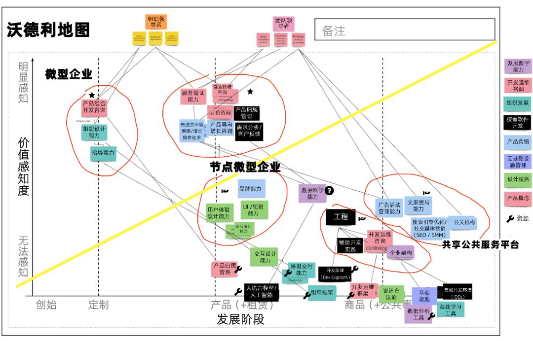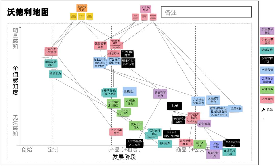 沃德利地图是由英国企业家Simon Wardley发明的一种商业战略框架,它提供了一种结构化的方式来讨论市场环境、呈现企业的价值链,并帮助识别出组织可以创新、提高效率或外包以获得竞争优势的领域。