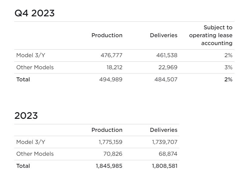 36氪获悉,特斯拉2023年第四季度汽车交付量为484507辆。2023年全年汽车交付量同比增长38%至181万辆;产量同比增长35%至185万辆。