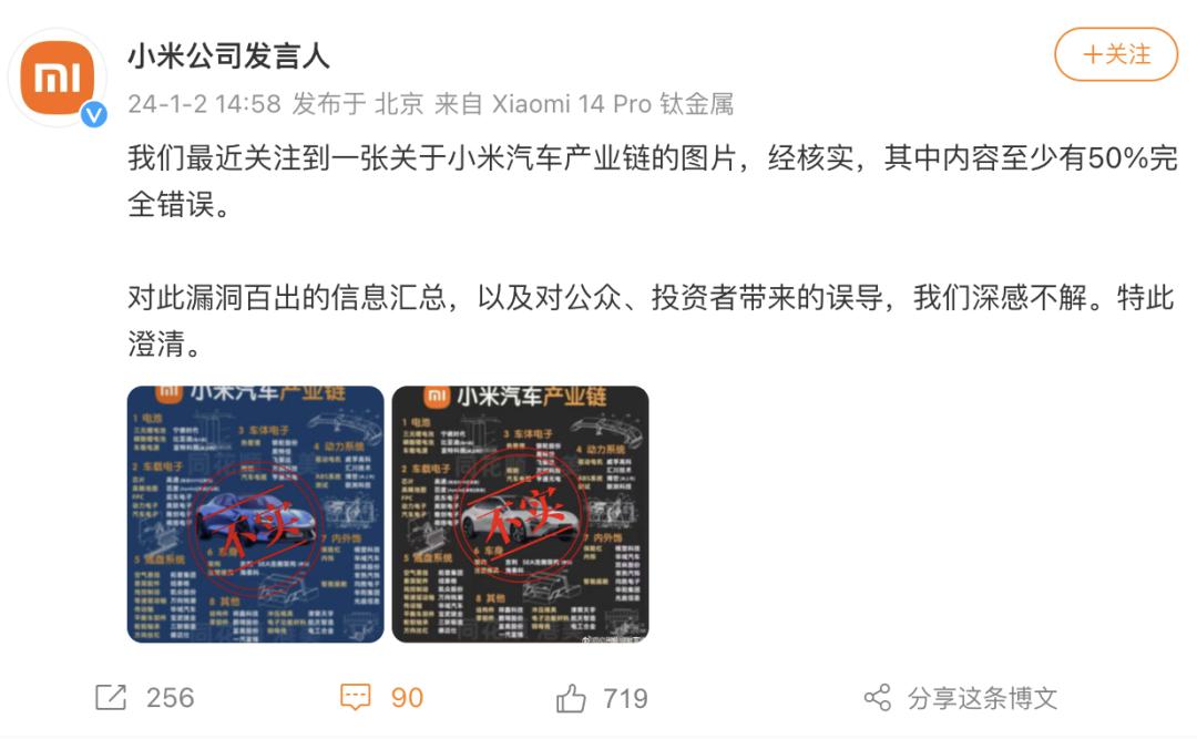 小米澄清:网传小米汽车产业链图片至少有50%完全错误