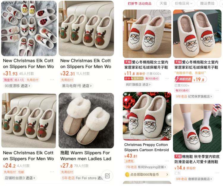 我们尝试在淘宝上输入“slippers”(拖鞋),在搜索结果中找到了一款应季的圣诞款毛绒拖鞋,价格在30-45元之间不等。可当我们点击进入商品图后,通过软件自带的“找相似”功能进行搜索,却发现相同款式的中文商品价格几乎“腰斩”: