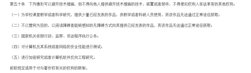 根据我国《著作权法》规定,违反保护作品技术措施的规定亦构成侵权。即使在满足“合理使用制度”的情况下使用作品,但需要规避技术措施才可以获得该作品,如果此种规避并不符合《著作权法》第50条关于避开技术措施的豁免规定,则可以在认定满足合理使用的基础上,同时认定构成违反技术措施而承担侵权责任。