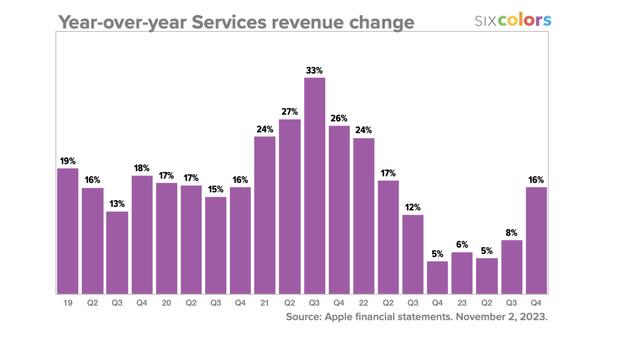 苹果报告称,2022年的收入为3830亿美元,因此尽管增长率为15%,但服务在24财年的总增长中仅占3%。长期以来,投资者似乎一直不明白服务增长令人印象深刻,但由于以iPhone为首的产品部门的年收入高达300 +亿美元,因此这一数字对整体业务来说并不重要。