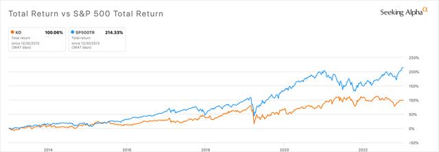 可口可乐曾是过去 50 年来最受欢迎的股票之一,但根据下图,该股在过去十年中的表现大幅落后于市场。