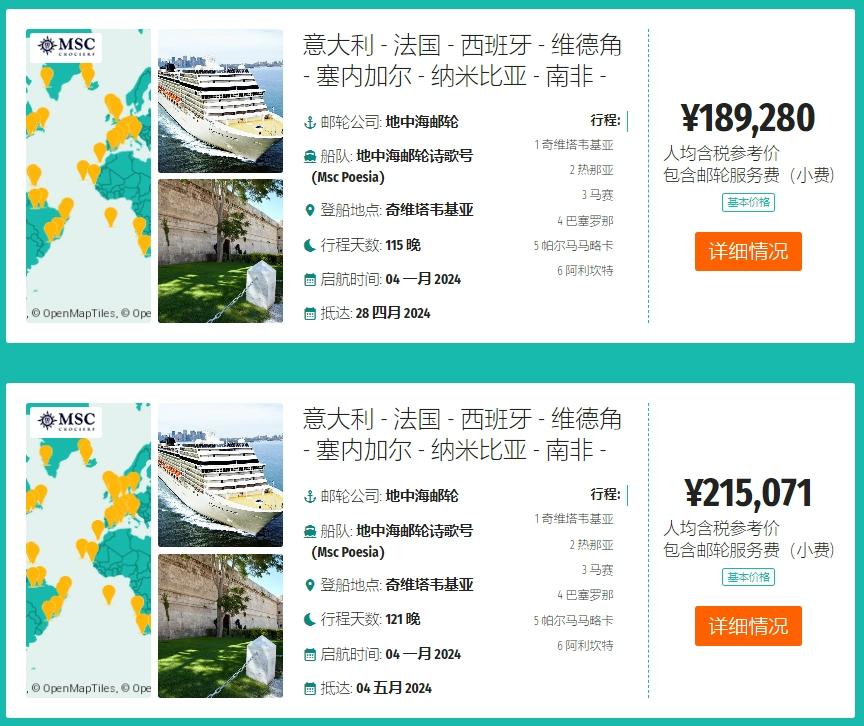 同样是三个月左右的环球旅行,其他游轮公司的费用,几乎全在10万元/人以上,甚至有高达19万元/人的。