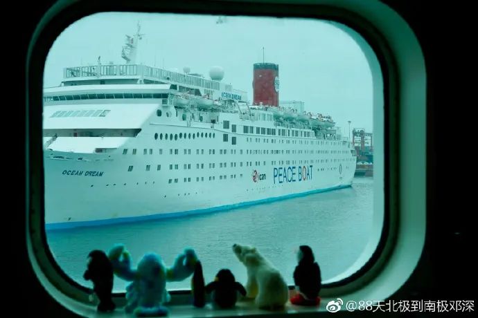 2018年,有乘客在另一艘船里见到了Peace Boat并拍下照片。(图/@88天北极到南极邓深)