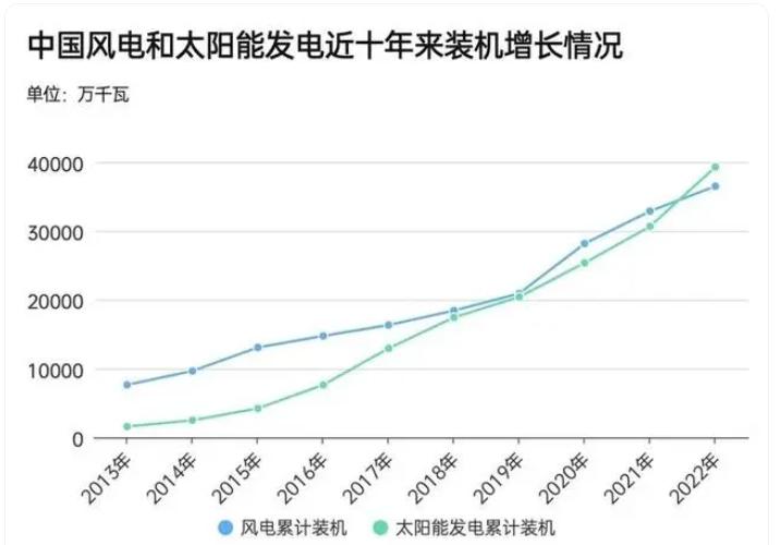 按双碳规划,两者未来将占据整个能源体系的半壁江山。目前来看,两者的装机量也大致相当。截至2022年底,风电装机规模3.65亿千瓦、太阳能发电装机规模3.93亿千瓦。