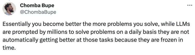 “从本质上讲,你解决的问题越多,就会变得越好,而大模型虽然每天被数以百万计的问题所触发,它们并不会自动地在这些任务上变得更加出色,因为它们的学习能力被冻结在了某一时刻。”