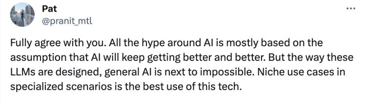 有网友认为:“围绕人工智能的所有炒作大多是基于这样一个假设:人工智能将会越来越好。但按照这些大型语言模型的设计方式,实现通用人工智能几乎是不可能的。在特定场景下的小众用例是这项技术的最佳使用方式。”
