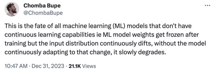 对于没有持续学习能力的机器学习模型来说,其权重在训练后被冻结,但输入分布却不断漂移。近两亿用户五花八门的新问题日夜不间断,如果模型不能持续适应这种变化,其性能就会逐步退化。