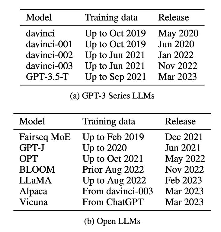为了实测任务污染的范围,论文中共评估了12种不同的模型,包括5个GPT-3系列封闭模型和Fairseq MoE、Bloom、LLaMA等7个开放模型,并列出训练集创建和模型发布日期。