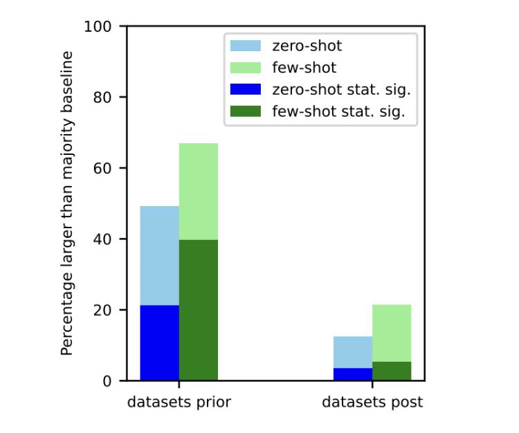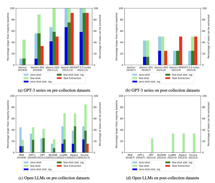 通过对所有数据集和LLM进行全球性的时间序列分析,发现对于在LLM发布之前收集的数据集(左侧),无论是零样本还是少样本任务中,击败多数基线的可能性都远远更大。