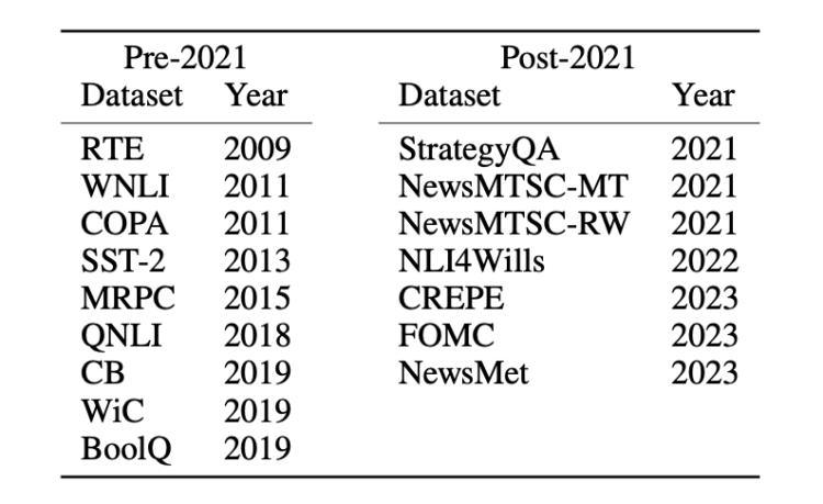 在数据集上则划分为两类:2021年之前和2021年之后发布的数据集。以此来对比新老数据集之间的零样本或少样本任务性能差异。