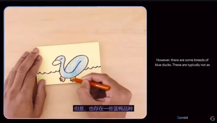 男子在纸片上画出一只鸭子,并为其涂上蓝色,AI在一旁回答:“这种颜色的鸭子不常见,但也存在蓝鸭品种。”男子拿出一只蓝色橡皮鸭放在地图上某一位置,AI说:“这片区域不太可能找到鸭子。”随后男子将一张纸团放在三个不透明的杯子下,随意打乱顺序,AI猜道:“纸团在左起第一个杯子里。”