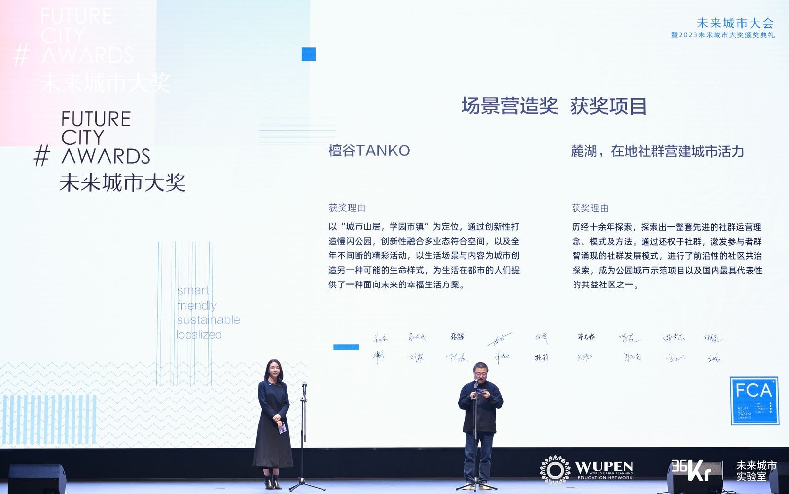 “檀谷TANKO”“麓湖:在地社群营建城市活力”荣获场景营造奖,大奖年度评审、A4美术馆馆长孙莉,年度评审、深圳市蕾奥规划设计咨询股份有限公司副总规划师刘泉,清华大学教授边兰春为两个项目的代表颁奖;