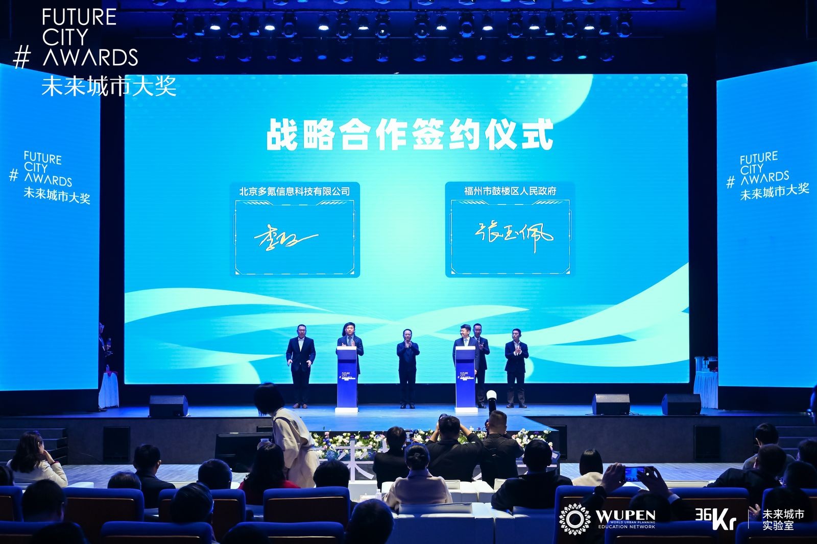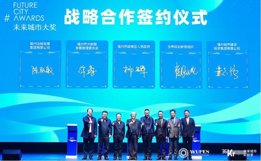 除了奖项的揭晓之外,到场的200余位领导、嘉宾也见证了福州冶城发展集团有限公司的揭牌仪式,世界规划教育组织、福州市鼓楼区人民政府、福州市大数据发展管理委员会、福州城市建设投资集团有限公司、福州冶城发展集团有限公司签订五方战略合作协议,以及福州市鼓楼区人民政府与36氪签订战略合作协议。