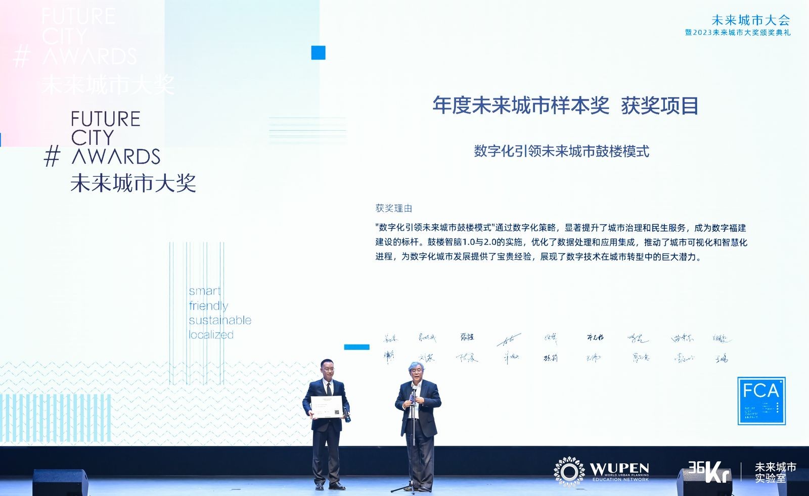 “数字化引领未来城市鼓楼模式”荣获年度未来城市样本,吴志强院士为项目代表鼓楼区委副书记、区人民政府区长杨辉颁奖。