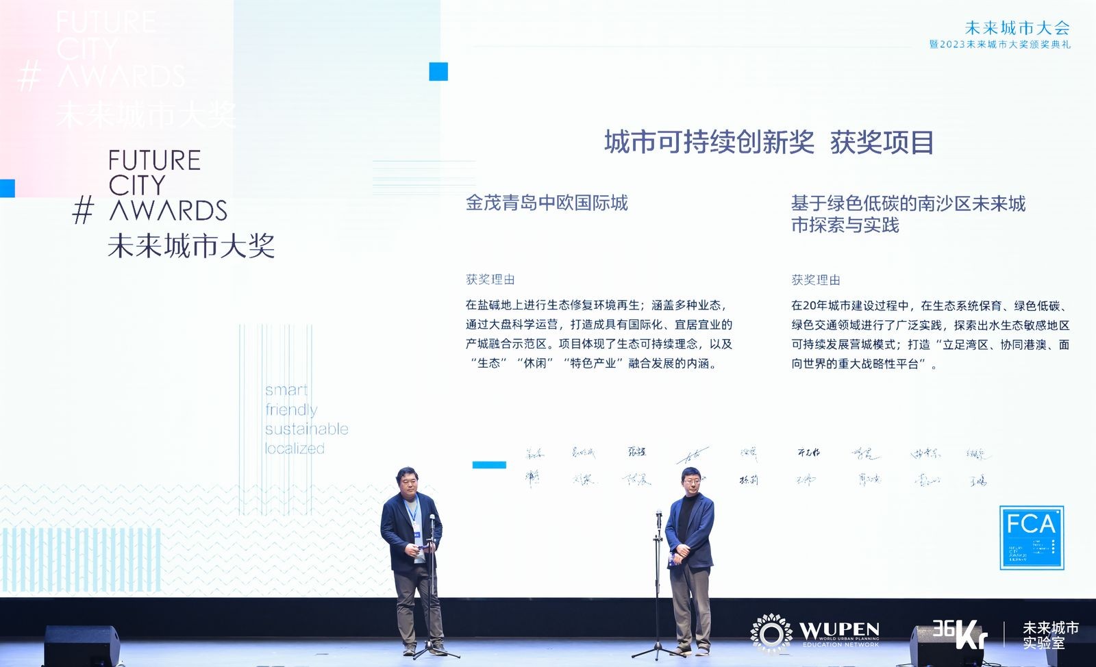 “金茂青岛中欧国际城”“基于绿色低碳的南沙区未来城市探索与实践”荣获城市可持续创新奖,大奖年度评审、中央财经大学政府管理学院城市管理系主任王伟,年度评审、腾讯研究院专家王鹏、天津大学教授闫凤英为两个项目的代表颁奖;
