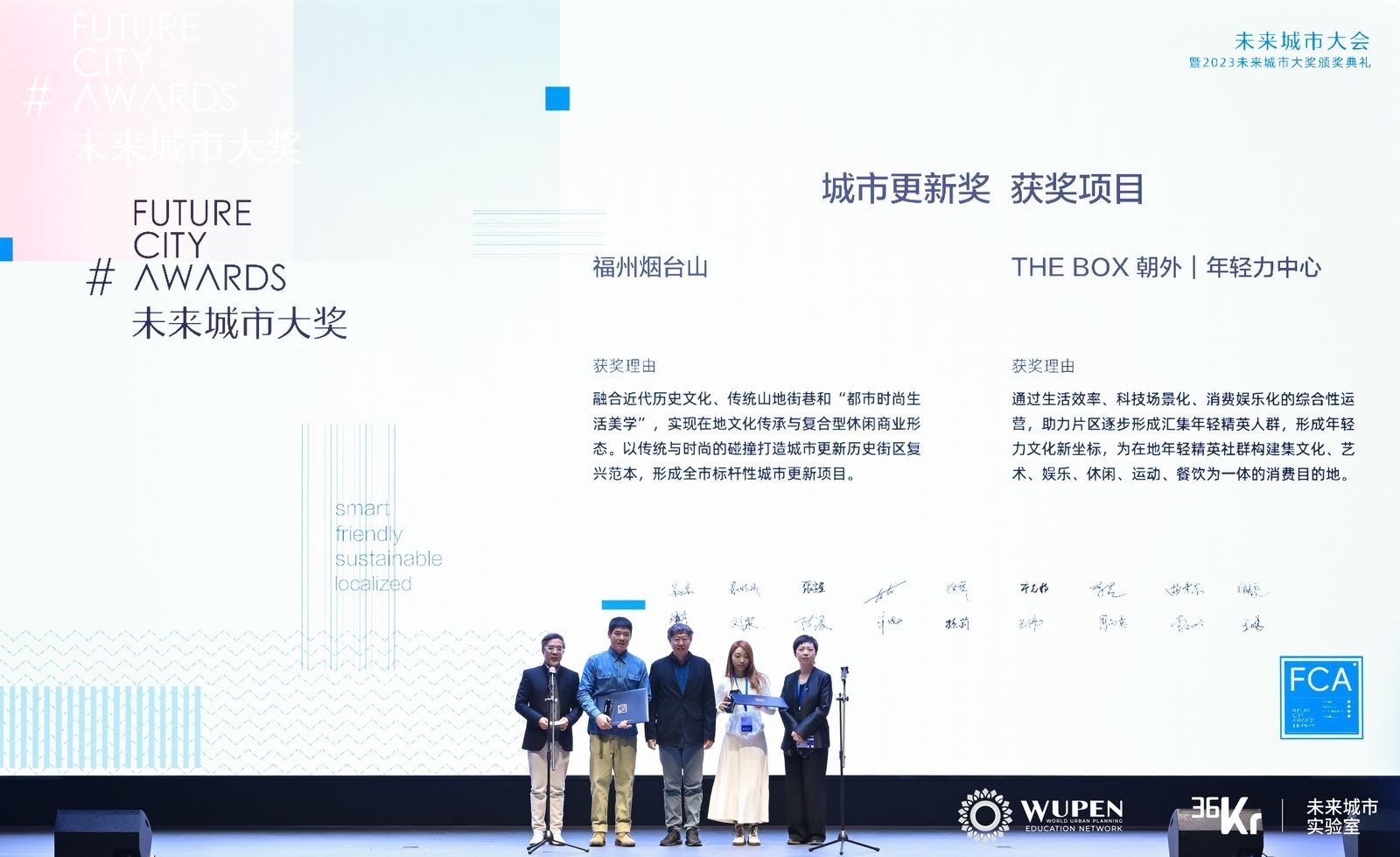 “福州烟台山”“THE BOX 朝外|年轻力中心”荣获城市更新奖,大奖年度评审、同济大学建筑与城市规划学院建筑设计方法团队责任教授徐磊青,年度评审、Aedas执行董事、城市设计、环境与规划学博士霍宁,WUPEN副主席、华南理工大学教授王世福为两个项目的代表颁奖;