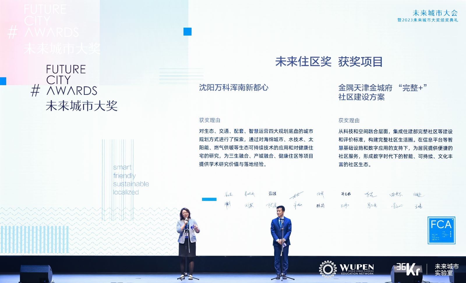 “沈阳万科浑南新都心”“金隅天津金成府‘完整+’社区建设方案”荣获未来住区奖,大奖年度评审、RET睿意德创始合伙人、全联房地产商会商业地产工作委员会副秘书长索珊,大奖年度评审、正大集团正大侨商 CIO曲景东,同济大学教授孙施文为两个项目的代表颁奖。