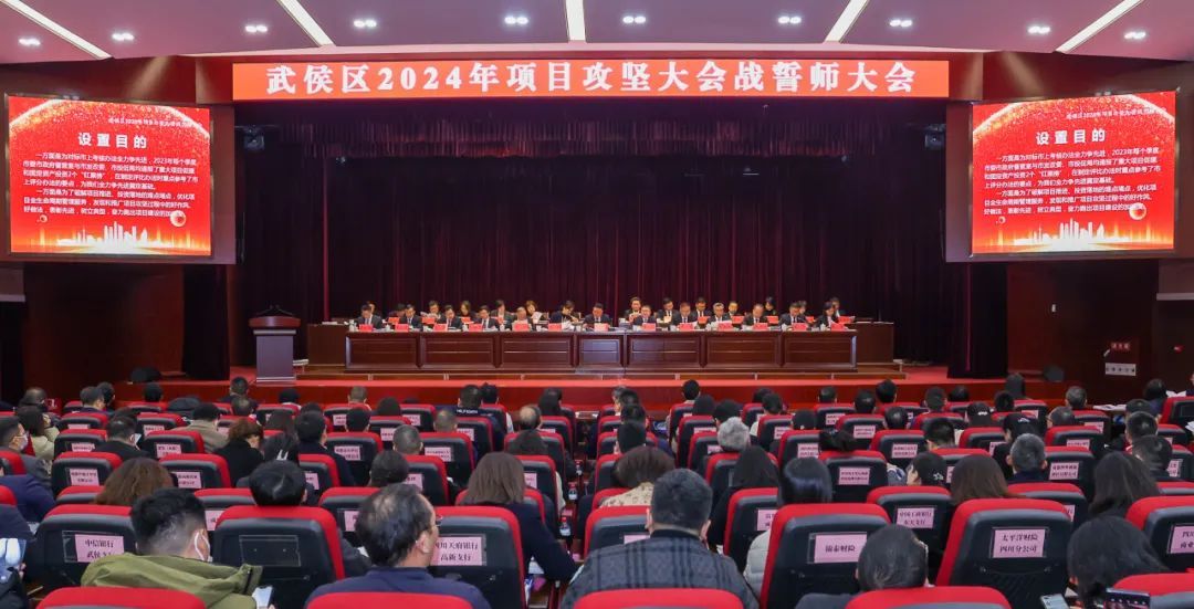 1月2日,新年首个工作日,武侯区召开“2024年项目攻坚大会战誓师大会”,深入贯彻党的二十大精神和习近平总书记对四川工作系列重要指示精神,全面贯彻落实中央经济工作会议和省委十二届四次全会、省委经济工作会议,市委十四届四次全会暨市委经济工作会议决策部署,以建设践行新发展理念的公园城市示范区为统领,发出全力以赴拼经济搞建设的动员令,吹响“项目攻坚”引领经济建设“加速度”的号角。