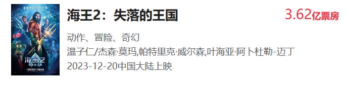 在北美,《海王2:失落的王国》(以下简称《海王2》)首映尚不到3千万美元,相比前作大幅跳水六成,并被媒体投以“烂番茄”待遇;在中国市场,提前两天上映的待遇、温子仁和杰森·莫玛的卖力宣传,最终迄今3.62亿人民币的成绩,不仅难敌当年,放在今年的进口片市场,也最多只能算差强人意。