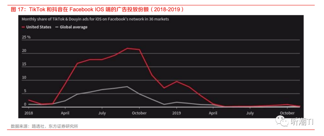 当时Tik Tok主要的投放渠道是Facebook,据腾讯深网报道,一位接近Facebook的人士透露,2018年三、四季度到2019年一季度,Tik Tok的推广预算每个季度维持着100%以上的增长。