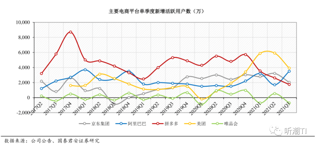 主要电商平台新增活跃用户数变化,图/国泰君安证券