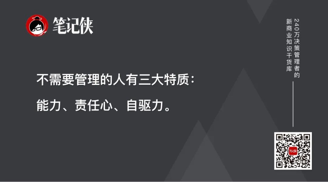 ① 找到志同道合的人才是最核心的事情,不需要管理的人有三大特质:能力、责任心、自驱力。