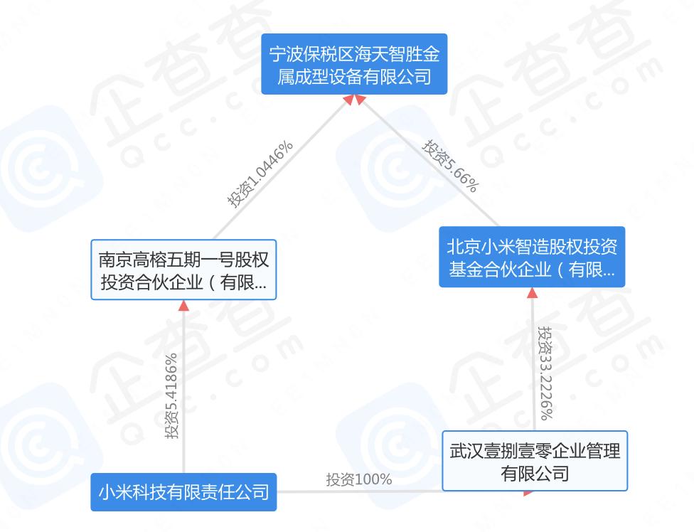 由小米科技有限责任公司参与的南京高榕五期一号股权投资合伙企业(有限合伙),曾在今年年初出资502万元获得了小米汽车一体压铸机供货商,宁波保税区海天智胜金属成型设备有限公司(以下简称“宁波海天”)1.44%的股份。