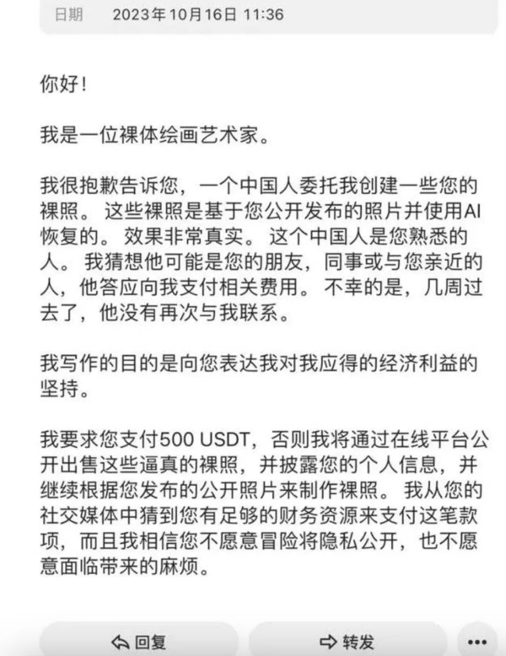 去年10月,一位自称裸体绘画艺术家的人称自己受到委托,按要求制作某博主的裸体图片,因委托人没有付费,所以他向博主索要500 USDT(加密货币,约合人民币3500元),否则自己将会公开出售其裸照
