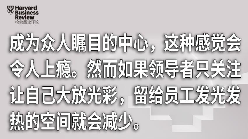 此外,成为众人瞩目的中心,这种感觉会令人上瘾。然而如果领导者只关注让自己大放光彩,留给员工发光发热的空间就会减少。