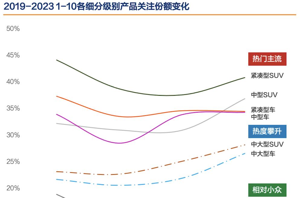 各细分级别产品关注份额变化(数据来源:汽车之家大数据(2020-2023.1-10))