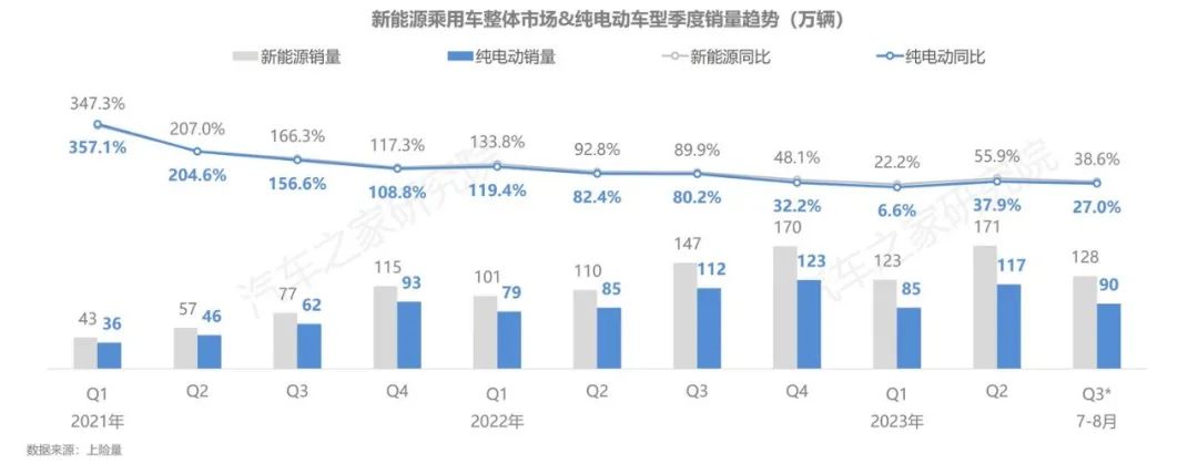 此外,从已知的统计口径来看,2023年的1-8月,新能源乘用车销量超420万辆,同比增长36%。其中,纯电汽车保有量更是超过1400万辆。