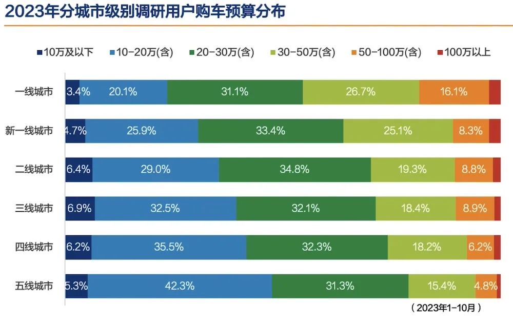 各城市级别用户购车预算分布图(数据来源:汽车之家调研数据【2021-2023】)