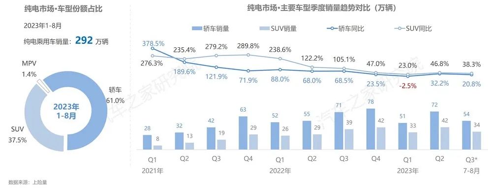 同时,截止到2023年第三季度,轿车仍是新能源纯电市场的主力车型,占据超过60%的市场份额。