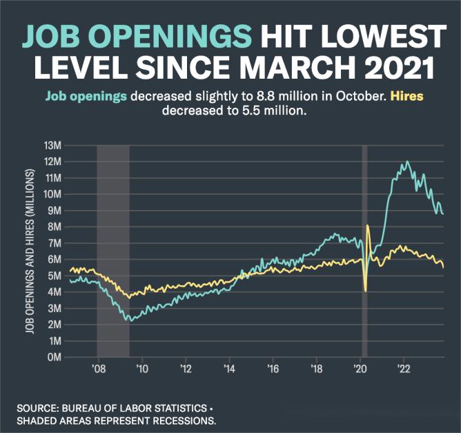截至11月底,美国职位空缺数量降至879万,创下自2021年3月以来的最低水平,低于华尔街的预期。美国劳工统计局周三发布的最新数据显示,这一数字较10月的885万略有减少,与彭博社调查的经济学家此前预计的882万相比也有所下降。此次数据反映出劳动力市场在2023年底前持续降温的趋势。