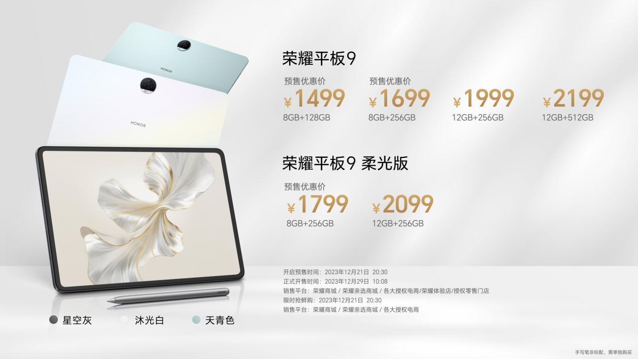 此外,发布会上同台亮相的“学习好伙伴 柔光更护眼”的荣耀平板9,搭载了行业领先的12.1英寸纸感护眼柔光屏,还拥有五重权威护眼认证、专业教育守护,以及12GB+512GB流畅双存,成为迄今荣耀最强的大屏护眼教育平板。此次荣耀平板9共推出8GB+128GB、8GB+256GB、12GB+256GB、12GB+512GB四个版本,预售优惠价1499元起。荣耀平板9柔光版推出8GB+256GB、12GB+256GB两个版本,预售优惠价1799元起。2023年12月21日20 : 30开启预售,2023年12月29日10 : 08正式开售。用户届时可前往荣耀商城/荣耀亲选商城/各大授权电商/荣耀体验店/授权零售门店进行选购。