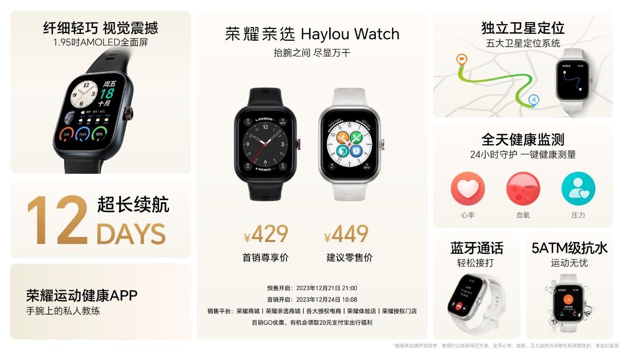 这次发布会也带来了荣耀亲选Haylou Watch智能手表,它采用1.95英寸轻薄全面屏,集成独立卫星定位、120种运动模式及心率、血氧、睡眠监测健康功能,支持12天超长续航,12月24日新品首销,售价449元,首销尊享价429元。