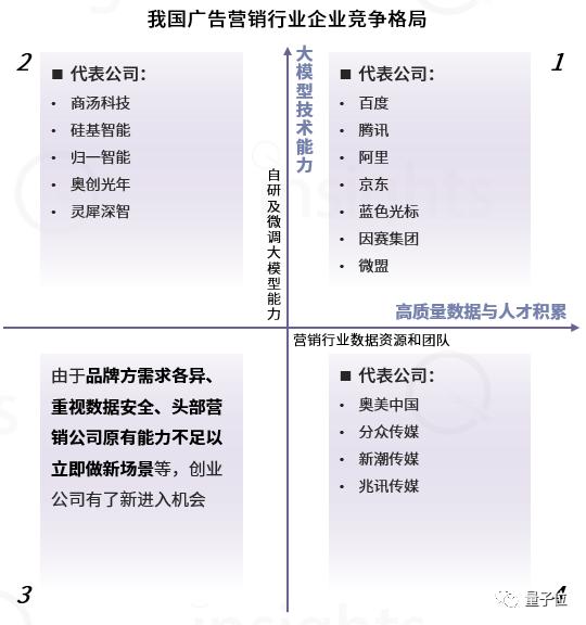广告营销行业玩家根据公司性质可大致分为互联网大厂、巨头类营销服务商和创业公司三大类。经量子位智库调研分析,这三类涉足广告营销赛道的公司的大模型技术和其产品与服务结合的现状如下: