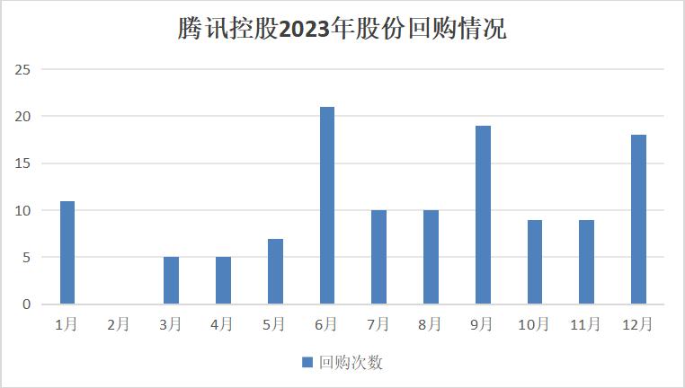 在2023年内,6月是分水岭,仅当月腾讯就进行了21次回购。此后,8月、10月、11月的回购次数都在10次左右,9月、12月回购次数分别为19次和18次。