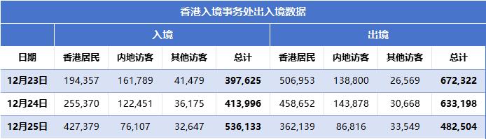 12月23日-25日期间,香港出入境人次连续3日超过百万,其中大多数为北上的香港居民,这3日内,内地访客入境香港人次分别为约16万、12万与7万,香港居民出境人次为约50万、45万与36万。